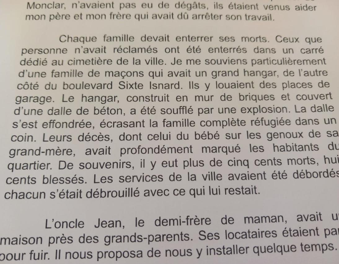 Hier, je finissais la maquette d'une biographie. La raconteuse, presque centenaire, la relira, l'annotera, la validera dans les prochaines semaines. Ensuite, son livre de souvenirs sera envoyé à l'impression. Mémoire d'un quartier de la ville, son témoignage de petite fille marquée par le bombardement du 27 mai 1944 m'émeut à chaque relecture. Je ne vous partagerai pas ses souvenirs personnels mais celui qu'elle a gardé d'une famille disparue ce jour-là.